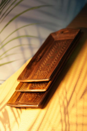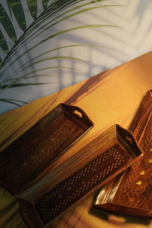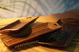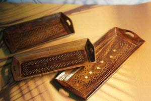 This image showcases a set of three handcrafted wooden serving trays, perfect for adding a touch of rustic elegance to your home decor. The trays are made from high-quality wood and feature intricate details that showcase the natural beauty of the material. They are stackable for convenient storage and can be used for serving a variety of items, from food and drinks to decorative items.