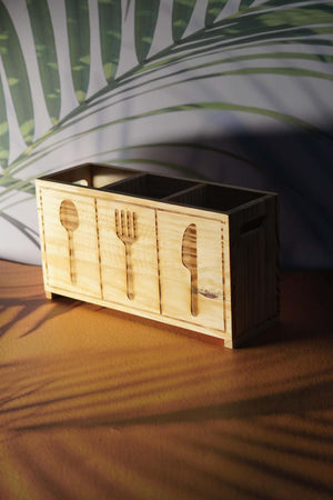 Versatile storage: This charming, hand-crafted wooden organizer keeps your cutlery neatly in place.