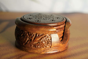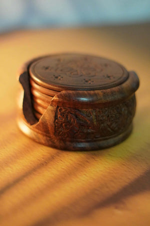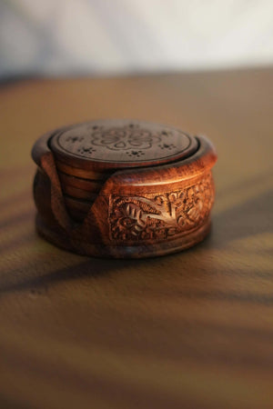 A set of six handcrafted wooden coasters, each featuring intricate floral carvings. The coasters come with a matching coaster holder, perfect for adding a touch of warmth and elegance to your home decor.
