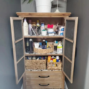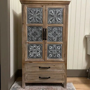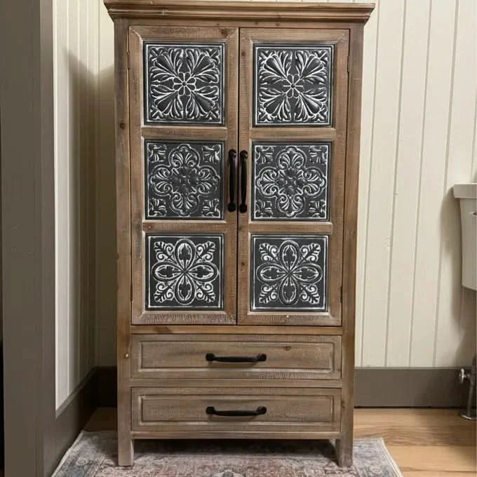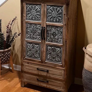 This accent cabinet brings a boho look and convenient storage to any space. It's made from solid and engineered wood with a purposefully distressed brown finish for a natural, lightly weathered feel. This piece features a rectangular silhouette and stands on bracket feet, with ornate light gray medallion designs across its cabinet faces. Store everything from books to barware in its two bottom drawers and one double-door cabinet with interior shelves. This chest measures 48" high and 27" wide, and works equally well in your bedroom, dining room, or living space.