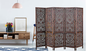 CRAFT DECOR bring you this Handmade Folding Partition Screen / Room Divider made from premium quality Mango Wood with beautiful floral carvings that gives an elegant and traditional look to your living room. The unit consists of 5 panels and each panel comes in a standard size of Height approx. 72 inches (6 feet) and 20 inches wide. We provide shipping to all parts of India. We provide best possible services to all our clients and believe in strong customer relationships