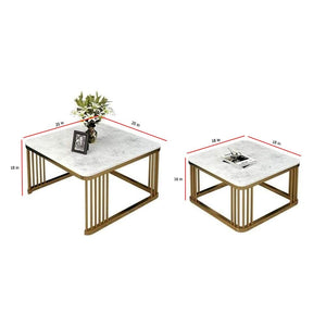 Use our unique square-shaped nesting table set to add an elegant design to your living room. A large and small coffee table is included to provide you with extra space so that you can display magazines and reading materials, while the other can be used to place a glass vase that decorates the living room. The cleverly designed base consists of powder coated metal frame. Our bold accent coffee table set will complement your home decor. Entertain in style with this 2 Piece Coffee Table Set. This distinctive two-piece occasional table set showcases intertwining tables with a gold-finished metal base that nestles together or can separate for additional entertainment and display space.