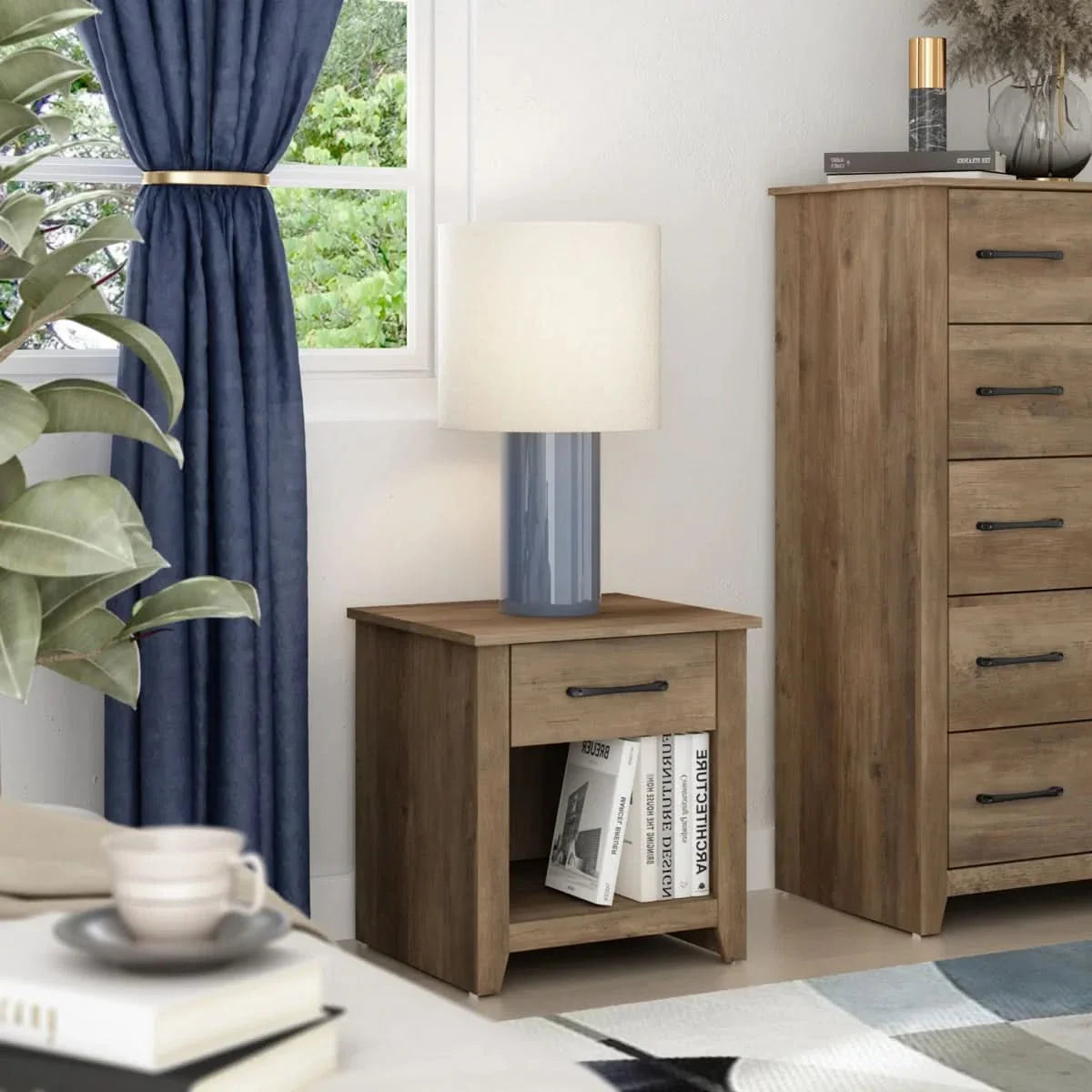 - 1-drawer storage: Offers space for storing essentials like remotes and reading glasses.