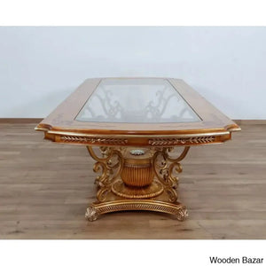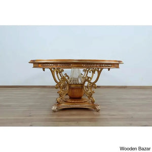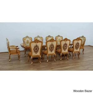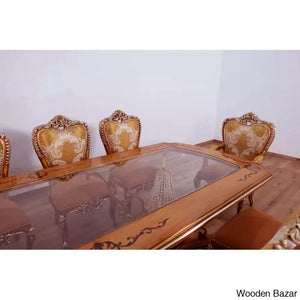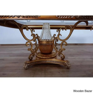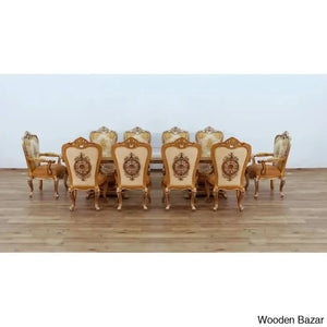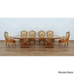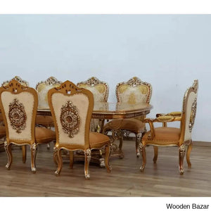 Craft Decor dining room collection aims to showcase its skill with crystal embellishments. Rich decorations, sumptuous, exquisite details, and the overall magnificence of the Craft Decor evoke the baroque furniture's opulence, which the designer interpreted with designs and decorations that referenced the elegance of both classic and contemporary styles. This dining area features exquisite carvings with a floral motif entirely produced by a select group of extremely gifted artists. In terms of quality and design, this product is the pinnacle of modern interiors. brown with mixed antique silver and light gold
