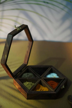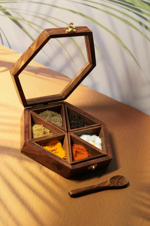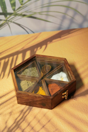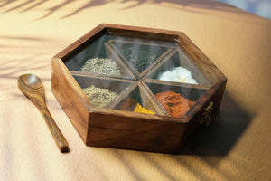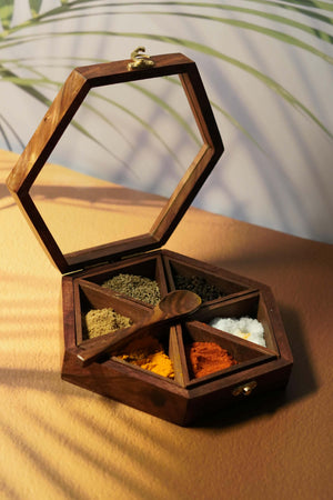 Descriptions This elegant and functional spice box is a handcrafted masterpiece, perfect for storing your favorite spices or dry fruits. The box is made from high-quality Sheesham wood, known for its durability and rich color. The hexagonal design is both stylish and practical, and the compartments are generously sized to accommodate a variety of spices. The box also features a transparent lid, allowing you to easily see the contents without having to open it.
