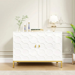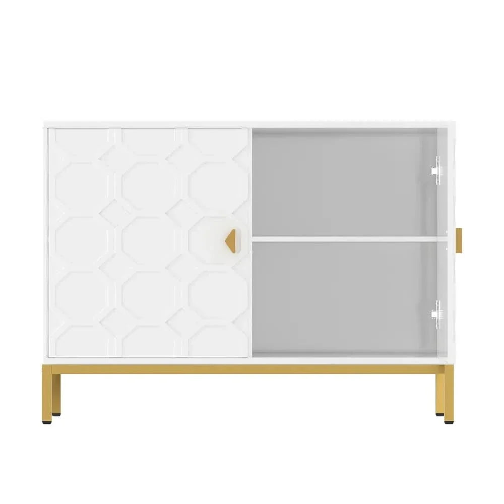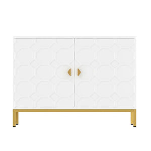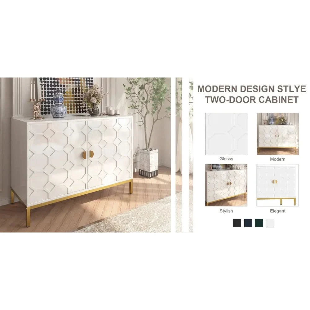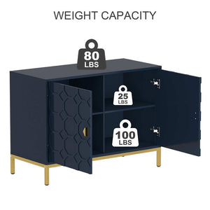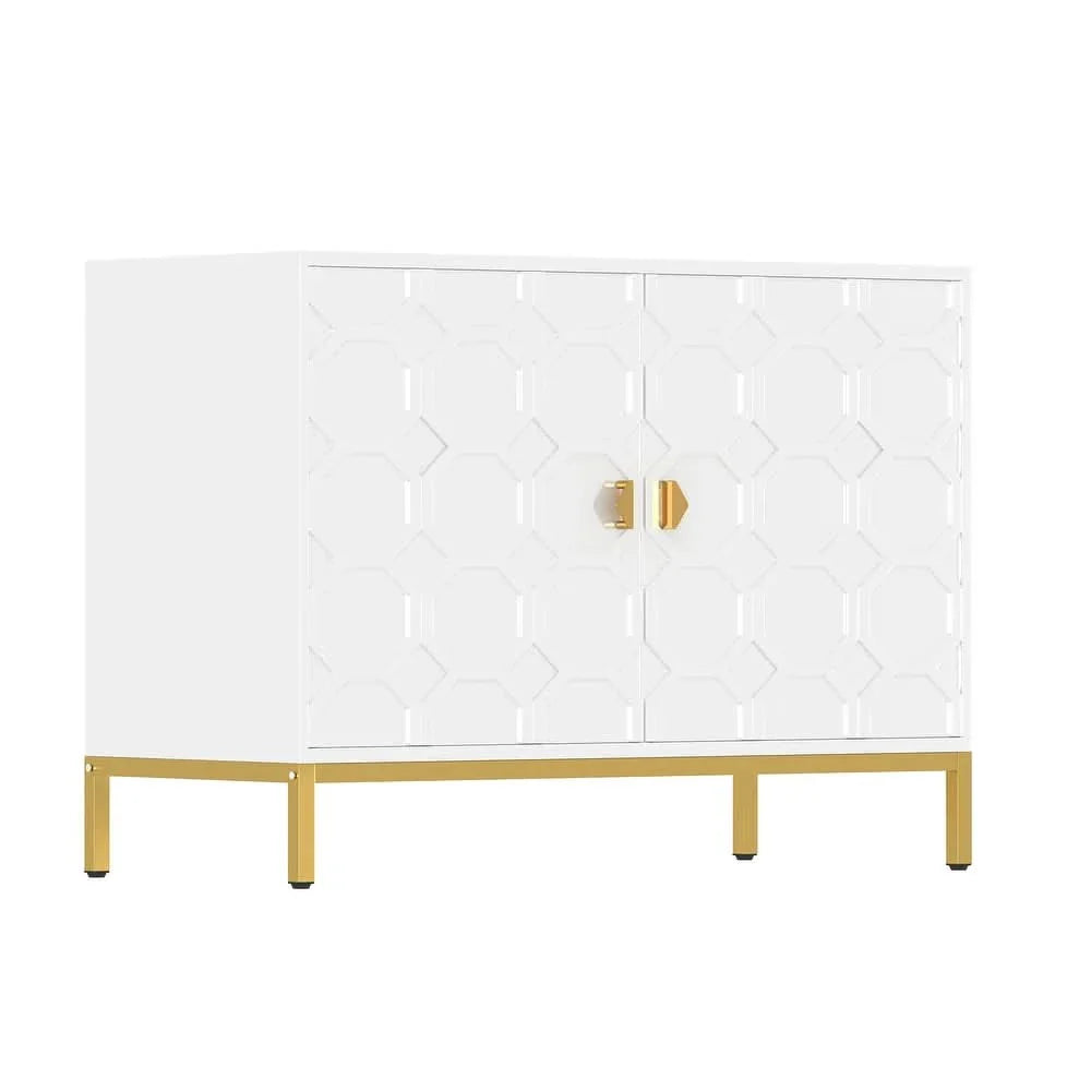 Enhance your home decor with the Clihome Freestanding 2-Door Storage Accent Cabinet, offering both a splash of color and functional storage space. Crafted from durable MDF with a glossy scratch-resistant PU paint finish, this cabinet is as stylish as it is sturdy. The raised honeycomb pattern on the doors, complemented by square golden metal legs and handles, adds an attractive and charming touch to any room.