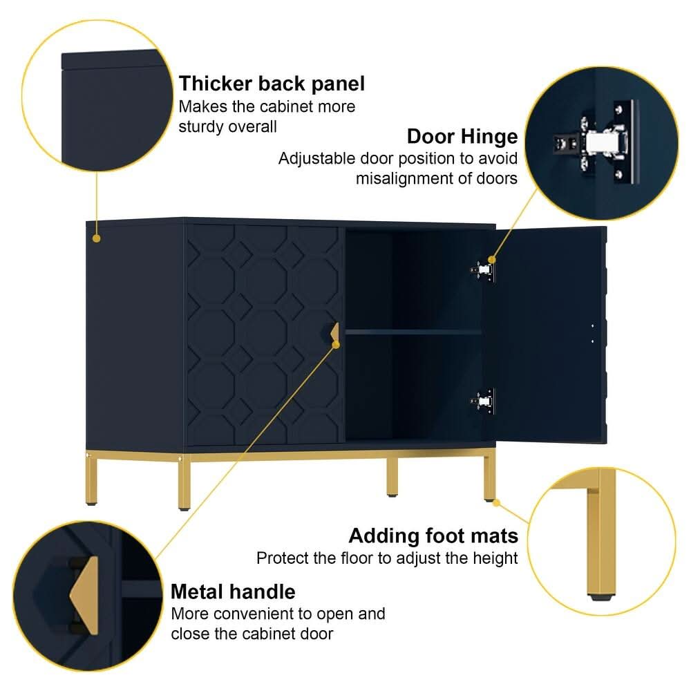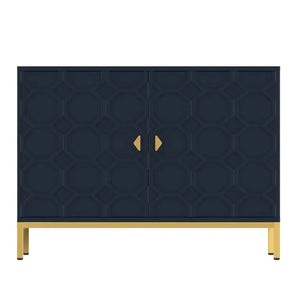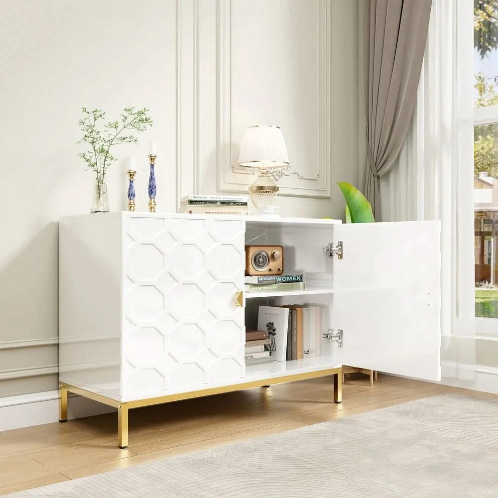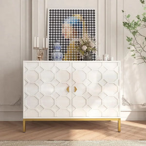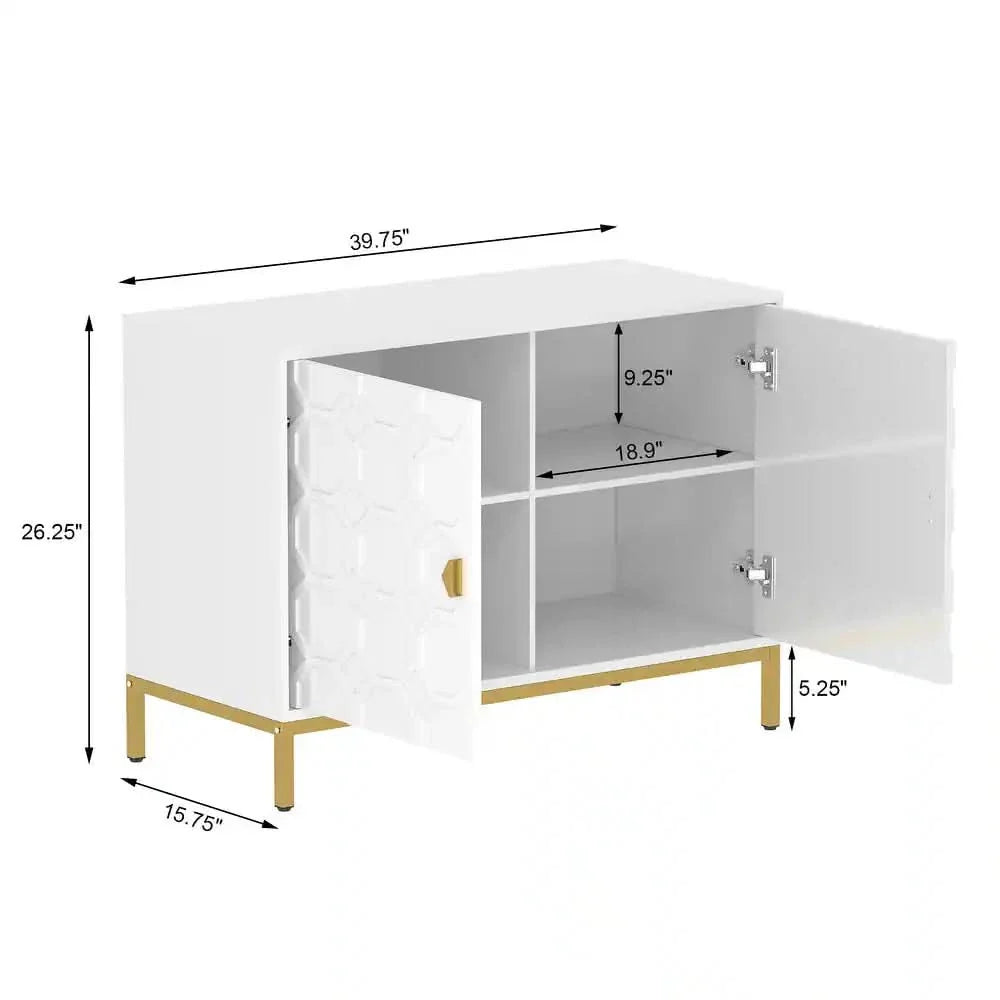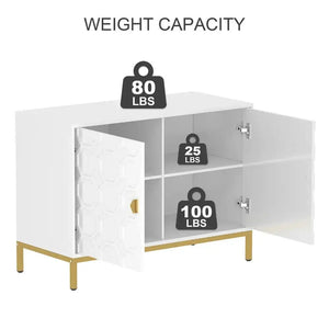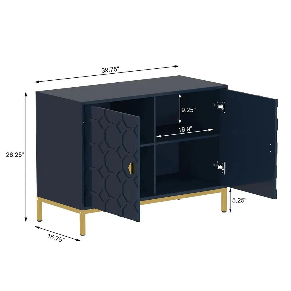Enhance your home decor with the Clihome Freestanding 2-Door Storage Accent Cabinet, offering both a splash of color and functional storage space. Crafted from durable MDF with a glossy scratch-resistant PU paint finish, this cabinet is as stylish as it is sturdy. The raised honeycomb pattern on the doors, complemented by square golden metal legs and handles, adds an attractive and charming touch to any room.
