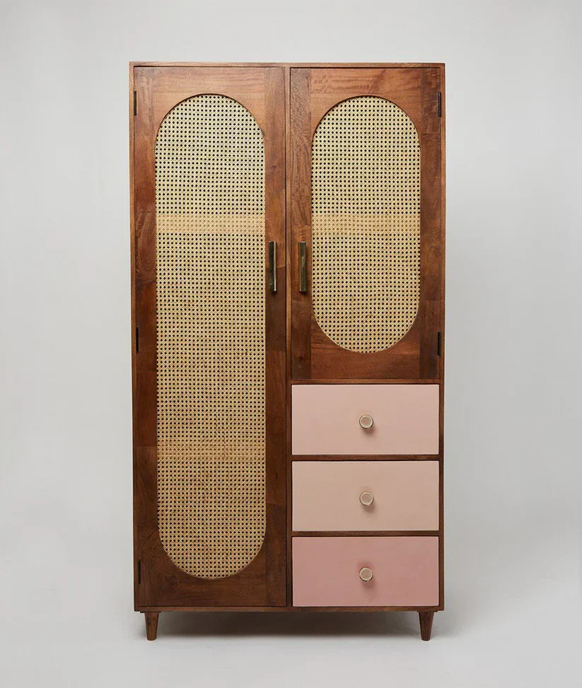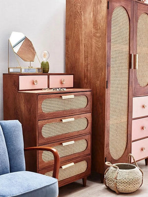 Rattan collection pairs darkly-stained mango wood with pops of color and hand-woven cane sheeting, for subtly colorful, contemporary pieces that will provide stylish storage space in your home. In an eclectic style that takes inspiration from mid-century furniture pieces, this wardrobe pairs softly curved cut-outs in its door fronts with hand-woven cane sheeting. Its drawers are painted delicate pastel pink, and it stands on short, tapered legs. The final finishing touch? The drawer pulls and door handles are made from gold metal, or ceramic with a crackle glaze.