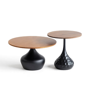 Modern Round Side Table with Wooden Top & Sculpted Black Pedestal Base