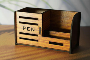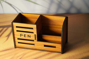 This beautifully crafted wooden pen stand is a perfect blend of style and functionality. With multiple compartments of varying sizes, it provides ample space to organize your pens, pencils, scissors, paper clips, and other desk essentials. The sleek design and rich wood finish add a touch of elegance to any workspace.