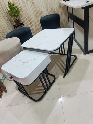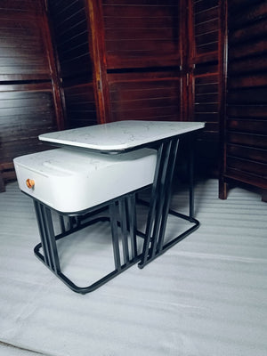 - STACKING SLIDING DESIGN : Set comes with one large table and one smaller Drawer Table allowing the smaller one to tuck underneath the larger. Compact for storage and easy to extend the holding and display space when required