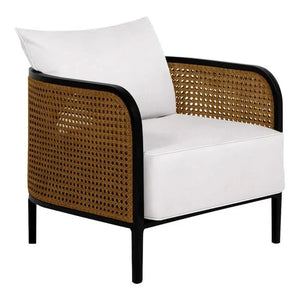 Inspired by classic open-cane weaving, the lounge chair is updated with all-weather, natural resin wicker framed by black aluminum for lasting good looks and durability. The gently curved silhouette of this piece gives it a unique silhouette that will enhance any outdoor setting.