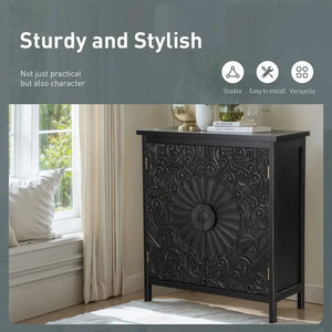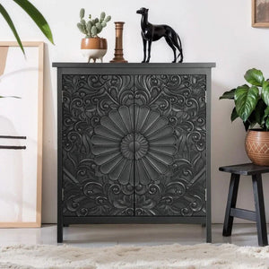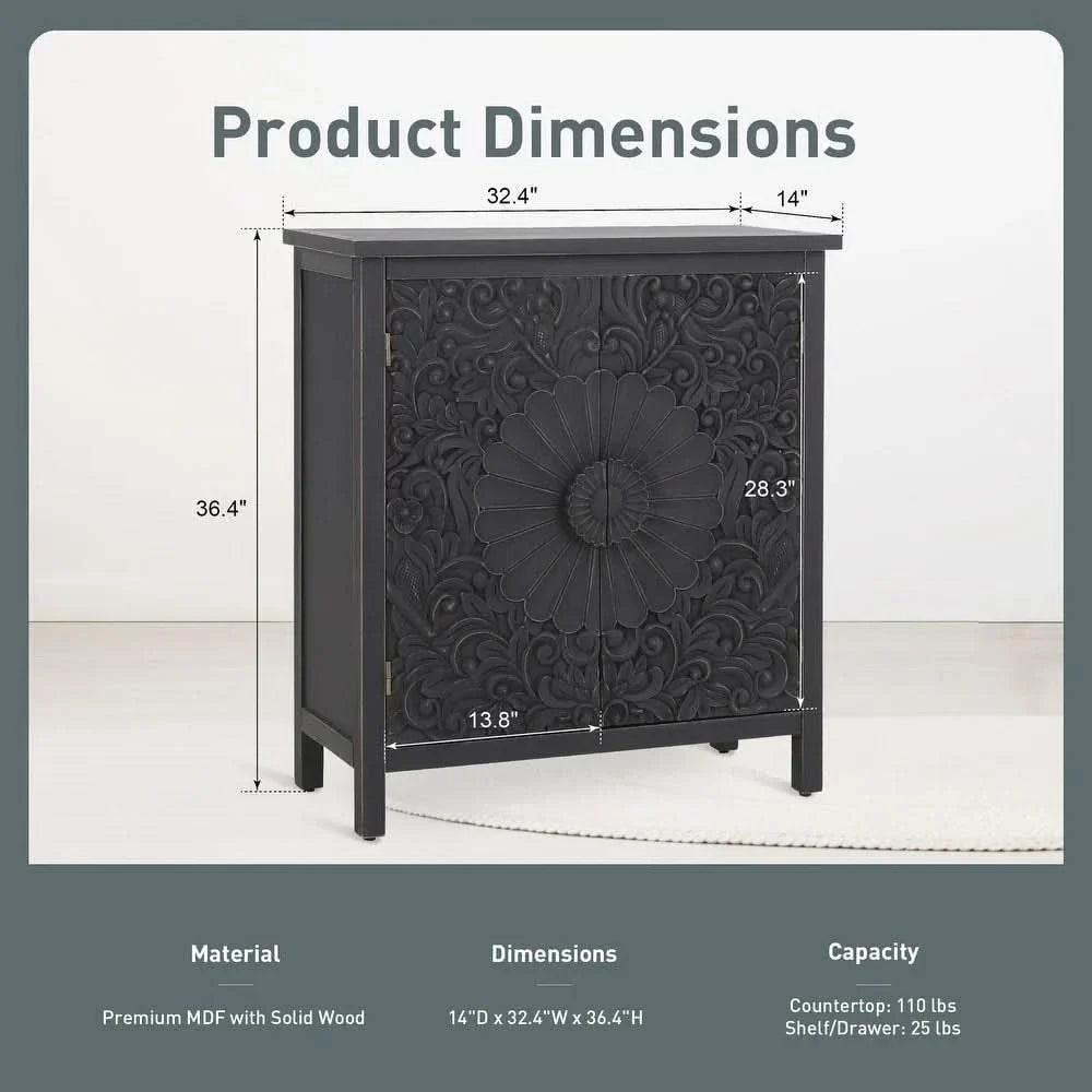 Vintage 2-Door Black Flower Carving Handle Distressed Storage Cabinet